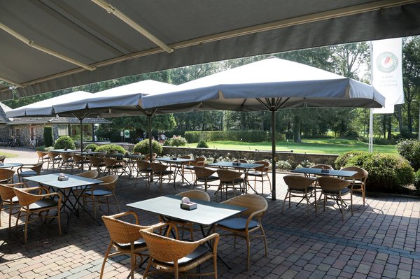 – bestens und mit großen Sonnenschirmen ausgestattete Außenterrasse direkt gegenüber dem Putting Grün und der ersten Spielbahn